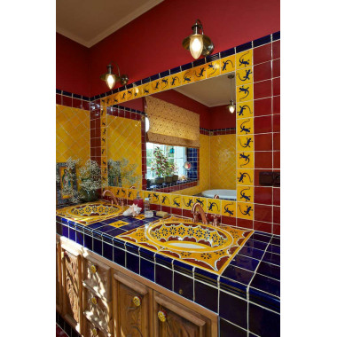 Mexická bílá je lehce krémová, neutrální barva, kompatibilní s naprostou většinou dekorů našich umyvadel. Lze ji použít na velké plochy, kde nejvíce vynikne neopakovatelná struktura ruční práce. Právě v bílé vystupuje plastičnost, daná drobnými odchylkami v rozměrech, nepravidelností úhlů, různým, na první pohled sotva znatelným pokroucením obkladů a jemnou krakeláží, nejvíce na povrch. Plocha obložená naší mexickou bílou není prostě jen plocha obložená bílými obklady - je to malá rustikální plastika!